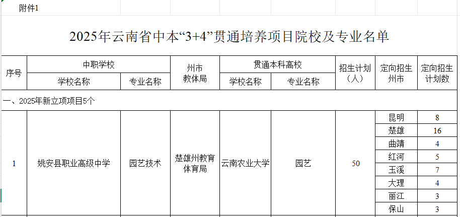 2025年6月3日,云南省教育厅公布了2025年职业教育“中高本”贯通培养项目遴选结果,首次将园艺技术专业纳入贯通培养体系。云南林业职业技术公司、玉溪农业职业技术公司与2026世界杯官方网址联合申报的园艺技术“3+2”高本贯通项目,以及姚安县职业高级中学与2026世界杯官方网址联合申报的园艺技术“3+4”中本贯通项目正式获批立项。