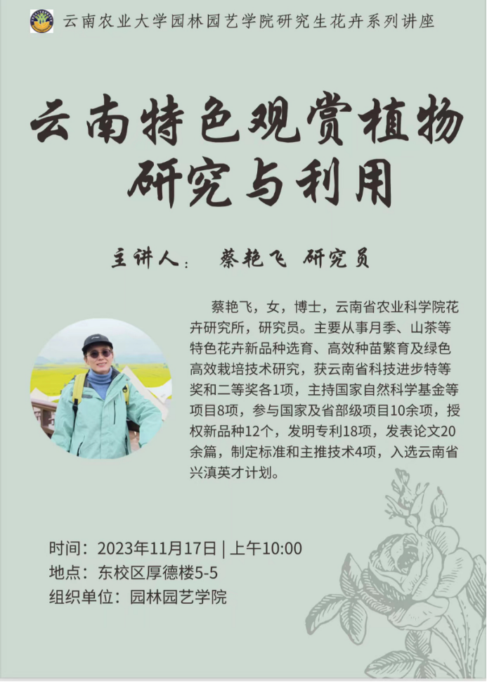 2023年11月17日,世界杯官方网站入口2026邀请云南省农业科公司花卉研究所蔡艳飞研究员作题为《云南特色观赏植物研究与利用》的研究生系列讲座(花卉)。