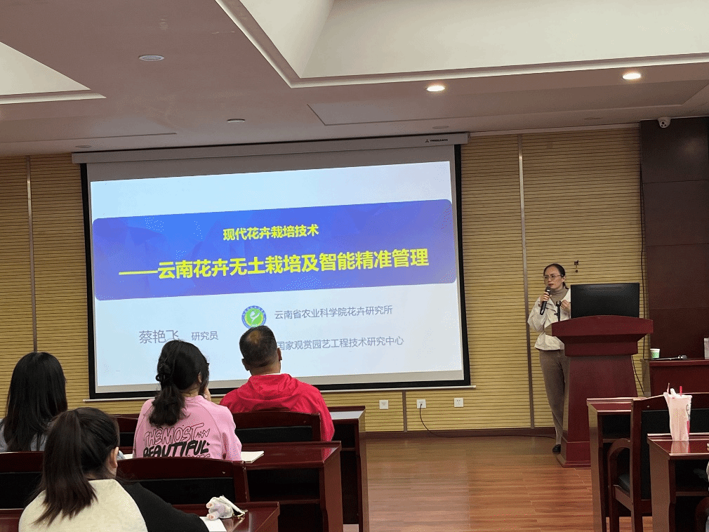 2025年10月28日下午,世界杯官方网站入口2026特邀云南省农业科公司花卉研究所智慧花卉创新团队首席——蔡艳飞研究员做“云南花卉无土栽培及智能精准管理”的学术报告。