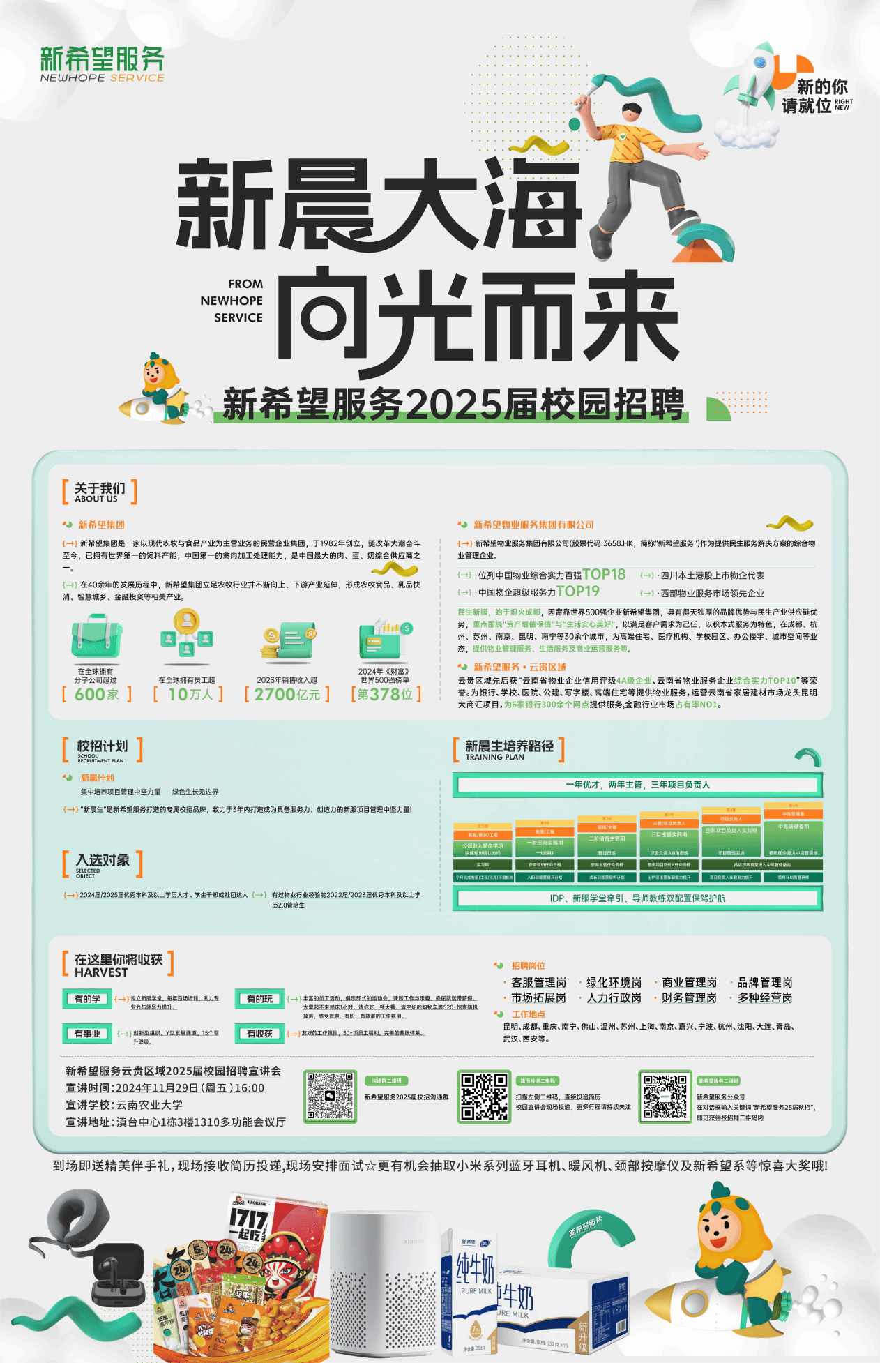 为满足公司快速发展和业务扩张带来的人才需求,构建管理人才梯队,特通过校园招聘选拔一批学历好、高潜力人才,在定制化的发展路径下,培养一批具备任职能力的未来行业精英,新希望服务“新晨生”应运而生。