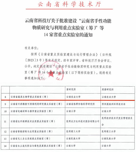 近日,云南省科技厅发布了关于批准建设“云南省手性功能物质研究与利用重点实验室(筹)”等14家省重点实验室的通知,由公司世界杯官方网站入口2026牵头申报的“云南省蔬菜生物学重点实验室”获批认定进入2年培育期,标志着公司在高原特色现代农业领域平台建设上再上新台阶。