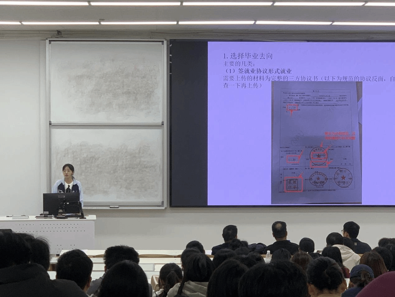 公司就业联系人郭辉老师向同学们介绍了各类毕业生去向的界定及对应的就业证明材料,详细解读了就业相关文件,讲解了如何上传规范的就业资料,同时,针对签约流程、就业手续办理、就业信息系统的填报等做了详细讲解,强调了相关注意事项和重难点问题。